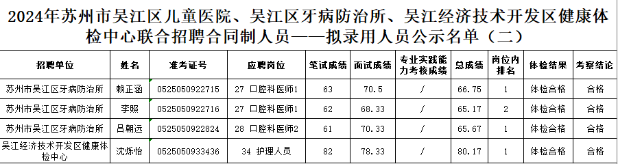 根据《2024年苏州市吴江区儿童医院、吴江区牙病防治所、吴江经济技术开发区健康体检中心联合招聘合同制人员公告》,经报名、笔试、资格复审、面试、体检、考察考核等程序,对以下拟录用人员予以公示。
