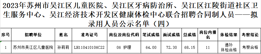根据《2023年苏州市吴江区儿童医院、吴江区牙病防治所、吴江区江陵街道社区卫生服务中心、吴江经济技术开发区健康体检中心联合招聘合同制人员公告》,经报名、笔试、资格复审、面试、体检、考察考核等程序,对以下拟录用人员予以公示。